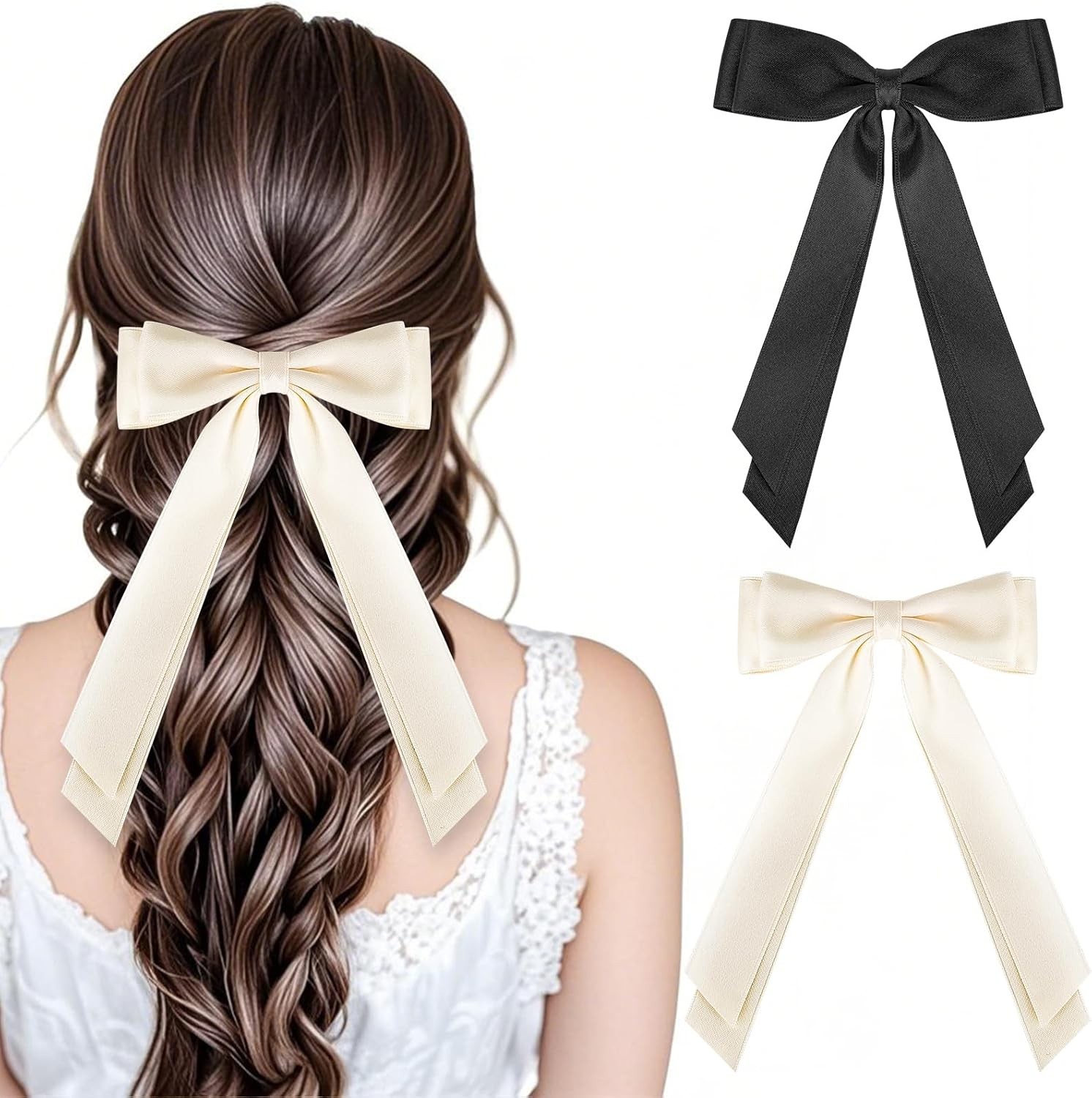 Bow Hair Clip, Hair Bows for Women Big Bowknot Hairpin French Hair Clips with Long Ribbon Solid Color Barrette Clips for Women Girls(Black+creamy-white)