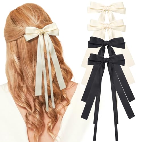 Mylot 4 Pcs Silky Satin Hair Bows Hair Clips for Women Girls Hair Bow Clips Tassel Ribbon Bowknot Barrettes with Long Tail, Hair Accessories for Women Girls
