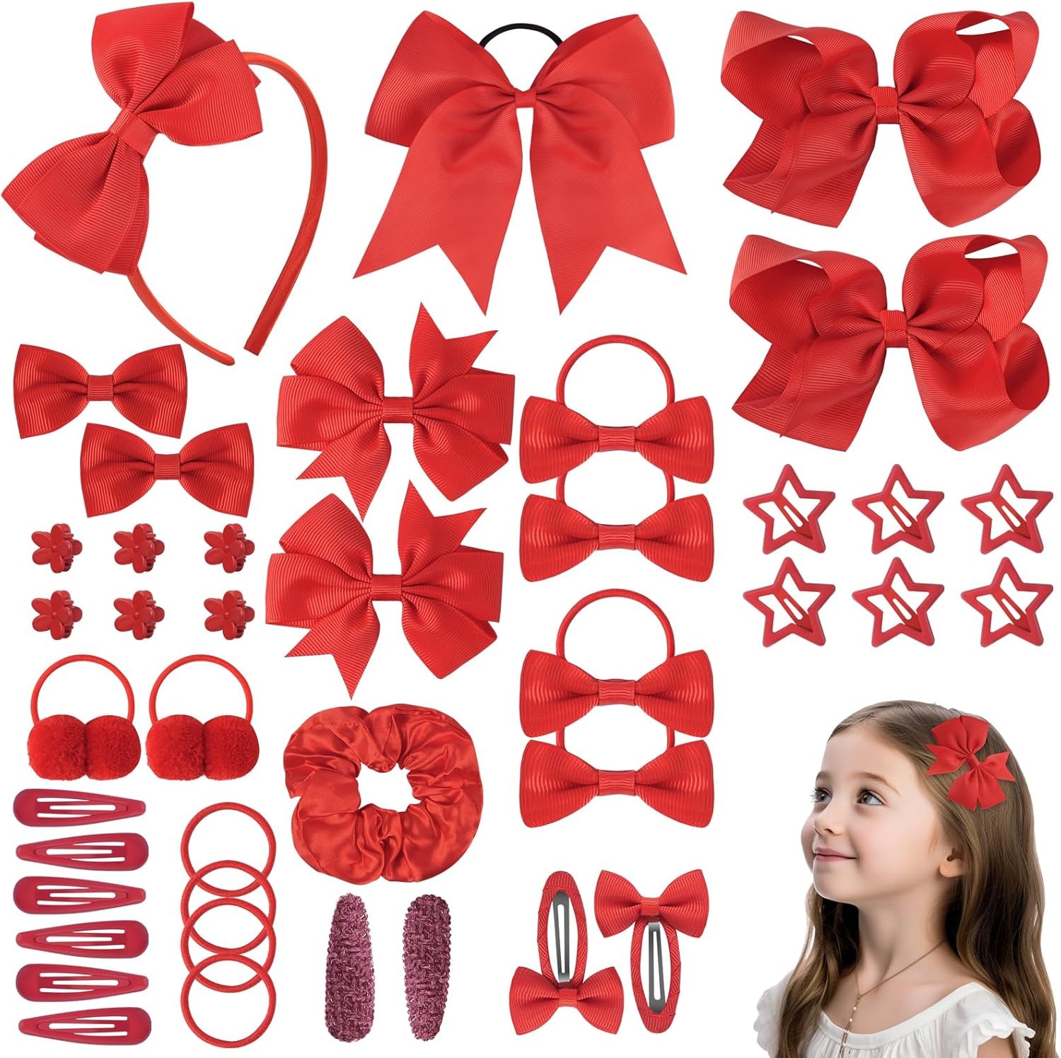 77Pcs Red Girls School Hair Accessories Kit, Hair Bows Elastic Headbands Hair Cl