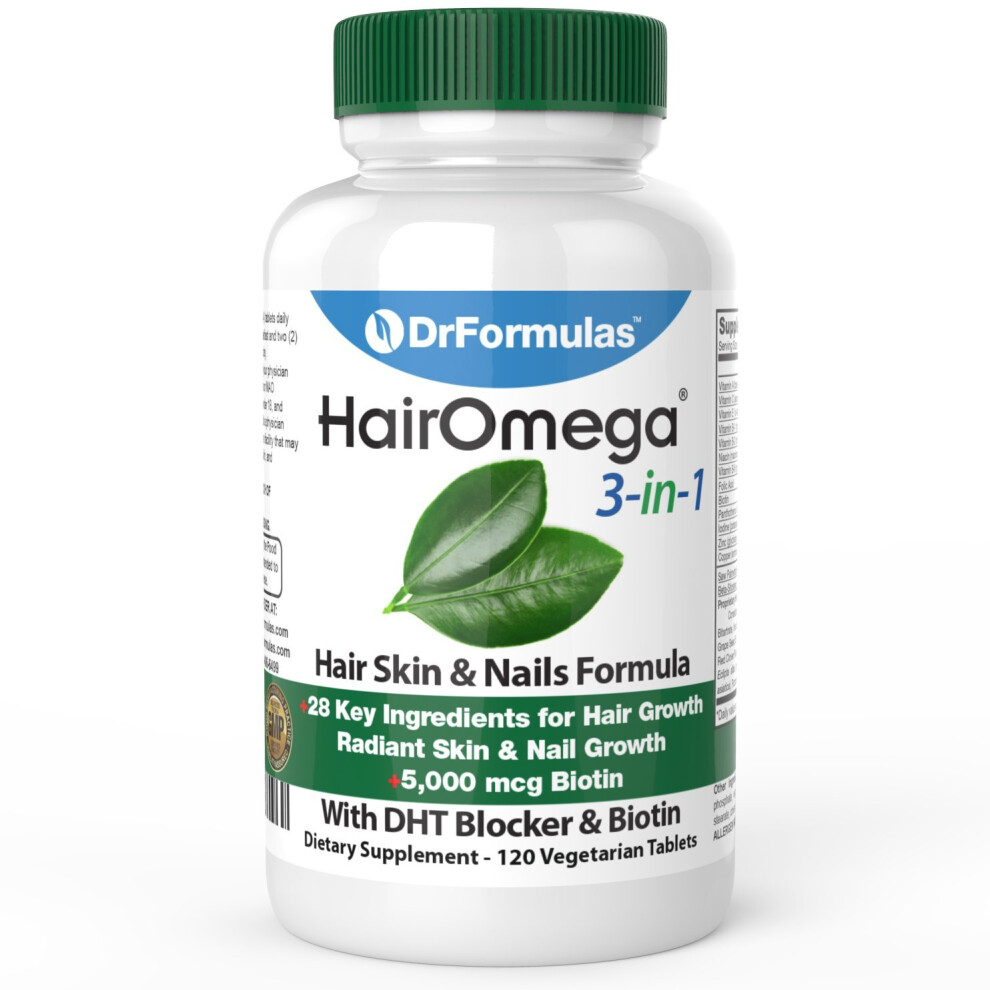 DrFormulas HairOmega 3-in-1 Hair Growth Vitamins with DHT Blocker, Biotin & Zinc for Women & Men â Supports Hair, Skin & Nails (120 Pills)