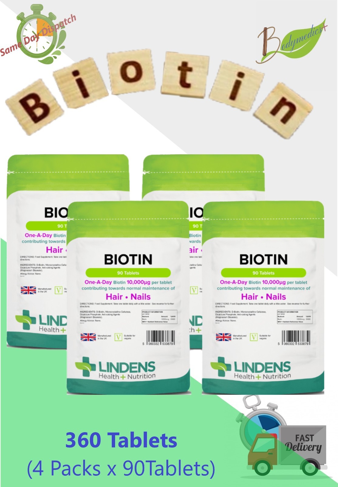 Biotin 10mg (10000mcg) Vitamins for Hair Skin Nails 360 Tablet (4x90) LINDENS UK
