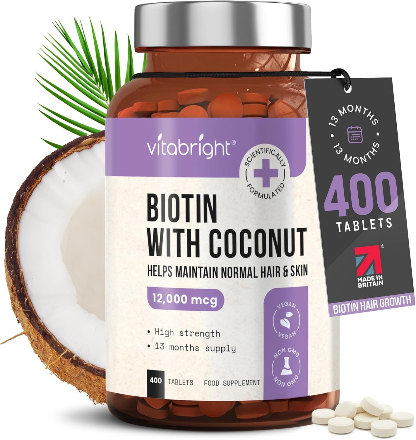 BiotinHair Growth Vitamins 12000mcg400Tablets Coconut for Hair Skin Nails Vegan