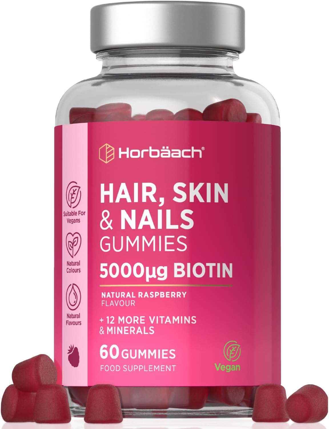 Hair Skin and Nails Vitamins | 5000mcg Biotin | Hair Growth Vitamins | with Added Zinc, Vitamin C, E & More! 60 Vegan Gummies | Supplement for Women and Men | by Horbaach