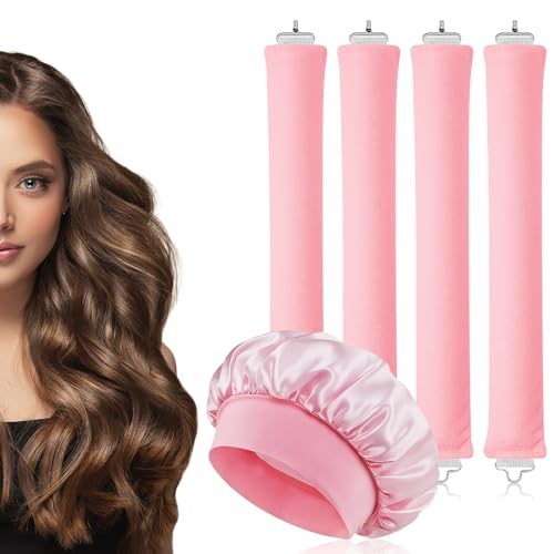 AOOWU 4PCS Heatless Curling Rods, Heatless Blowout Rods with Satin Silk Bonnet, Overnight No Heat Hair Rollers, Flexi Bars with Hooks, Heat Free Curling Iron for All Hair Types, Sleep DIY Hair Curls