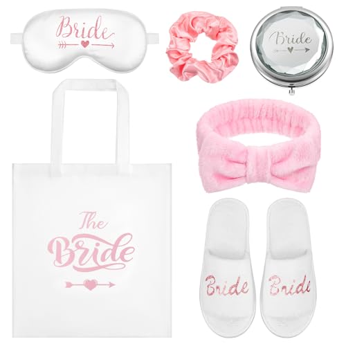 Hestya 6 Pcs Bride Gifts Bridal Shower Gifts Including Bride Slippers, White Scrunchie, Hair Headband, Tote Bag, Silk Eye Mask, Makeup Mirror for Wedding Proposal Spa Party (Pink)