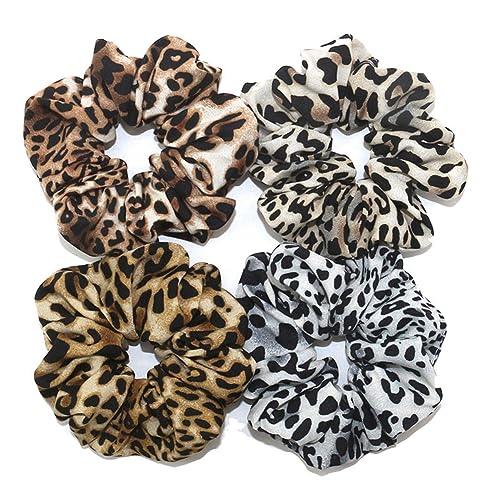 Yurosiay Pack of 4 Women's Leopard Scrunchie Hair Bobbles Elastic Fabric Hair Bobbles Colourful Leopard Print Scrunchies Leopard Hair Bands Ponytail Holder Leopard Hair Accessories for Women and Girls