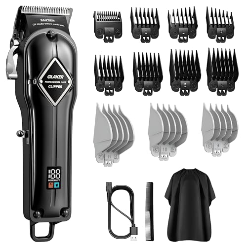 GLAKER Hair Clippers for Men - Cordless Professional Barber Clipper Hair Cutting Kit with 11 Guide Combs for Haircut, Trimming & Grooming (Black)