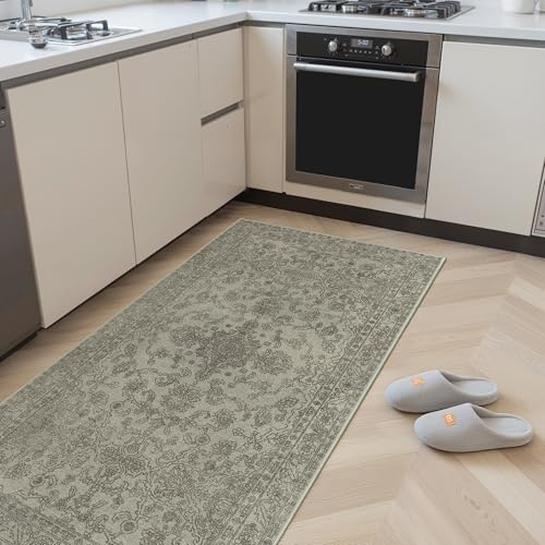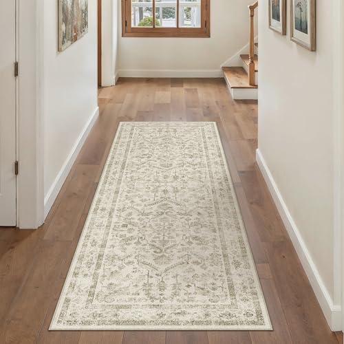 PureCozy Vintage Washable Beige Hallway Runner Rug 60x180cm Hall Runner Long Area Rugs Non Slip Soft Carpet Kitchen Bedroom Bedside Dining Room Office Indoor Low Pile Carpets