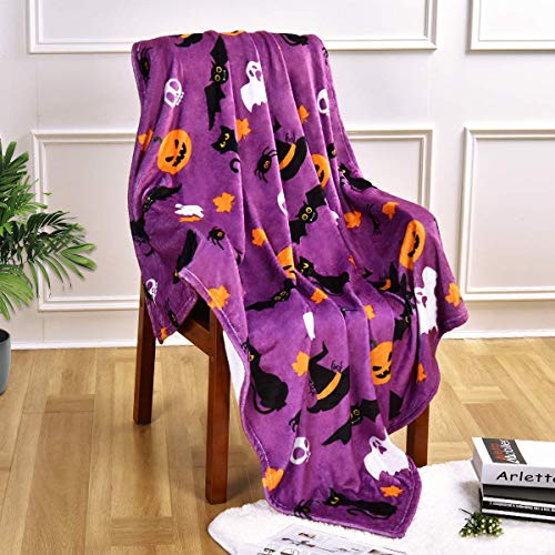 JOOCAR Flannel Throw Blanket Halloween Pumpkin Purple Ghost Bat Spooky Cats Cozy and Soft Plush Warm Blankets for Bed Couch Living Room Sofa Chair(125 x 100cm)