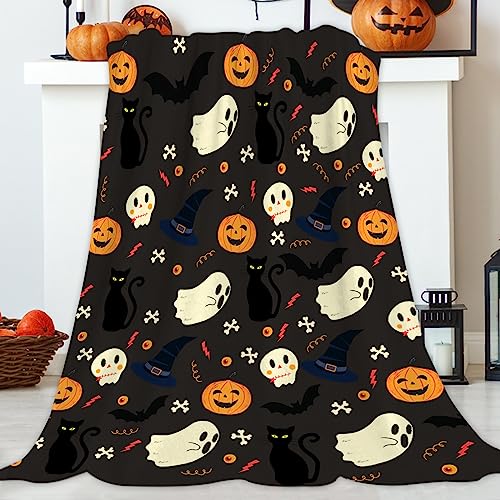 JOOCAR Flannel Throw Blanket - 150x200 cm, Halloween Pumpkin Ghost Black Bat Spooky Witch Hat Cats Cozy and Soft Plush Warm Blankets for Bed Couch Living Room Sofa Chair
