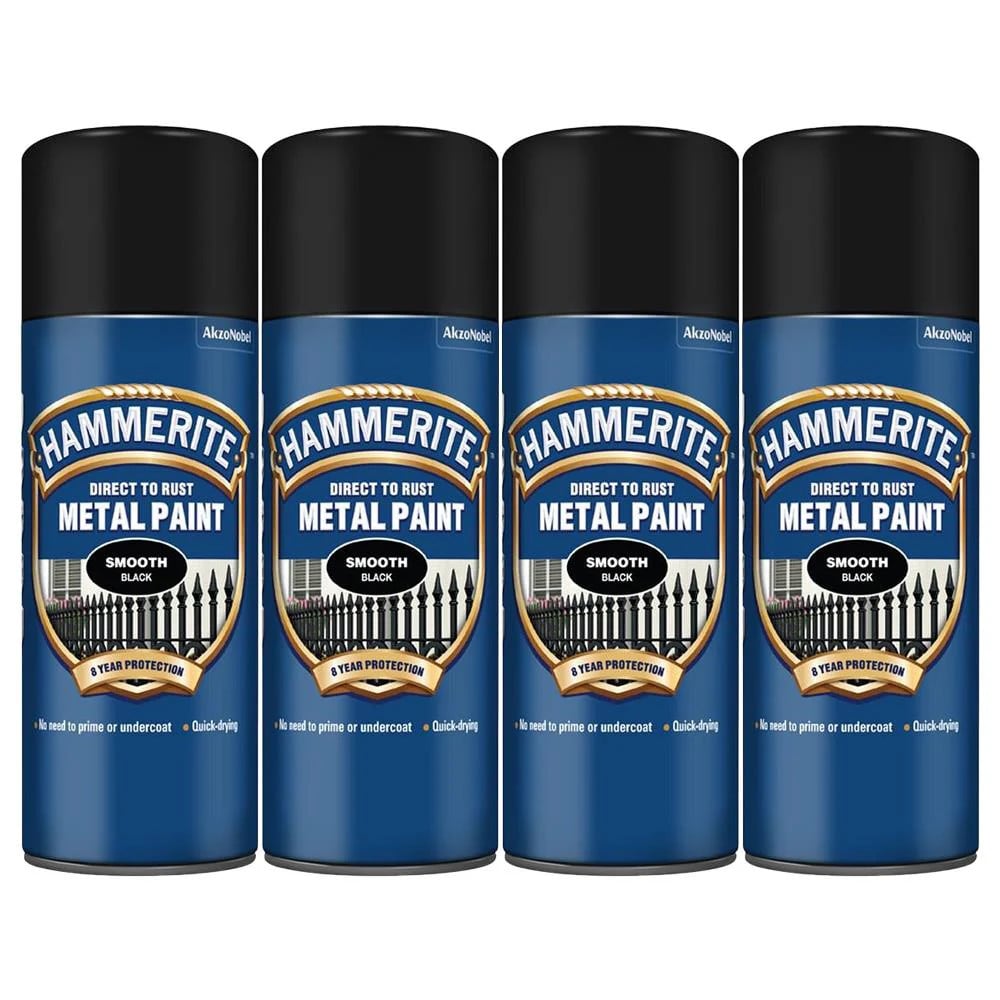 Hammerite Black Direct To Rust Smooth Aerosol Quick Drying 400ml Metal Paint x 4
