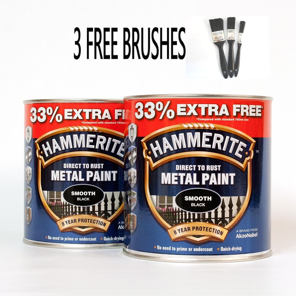 Hammerite Metal Paint Smooth - Black - 2L Value Pack Now With 3 Free Brushes