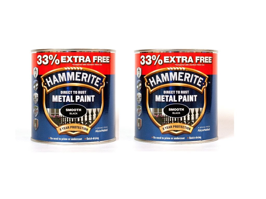Hammerite Metal Paint Smooth Black 750ml + 33% Free Direct To Rust 1L Protection