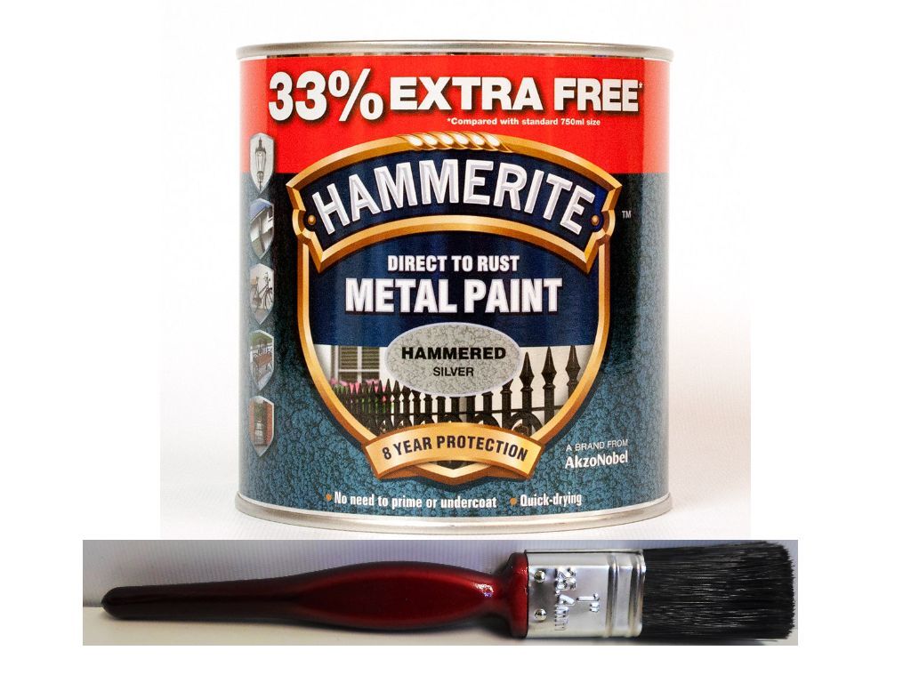 Hammerite Metal Paint Hammered - Silver - 750ml 33% EXTRA FREE 1L Tin Free Brush