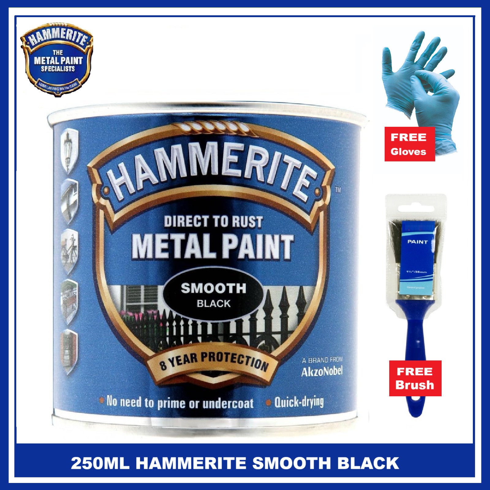 Hammerite Smooth Black Direct to Rust Metal Paint 250ml WITH FREE BRUSH & GLOVES