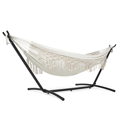 Mondeer 2 Person Hammock with Stand, Bohemian Style Portable Garden Double Hammock, Metal Frame Adjustable, Suitable for Outdoor Terraces, Patios and Gardens, up to 270kg, Beige