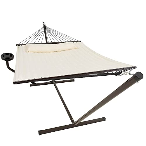 GOCAN Quilted Fabric Double Hammock Won't flip with Stand and Spreader Bars,Safer and Sturdier,Quality Hammocks for Outdoor Indoor Patio Yard