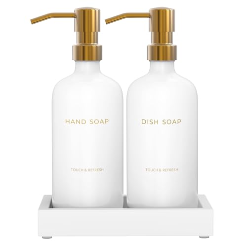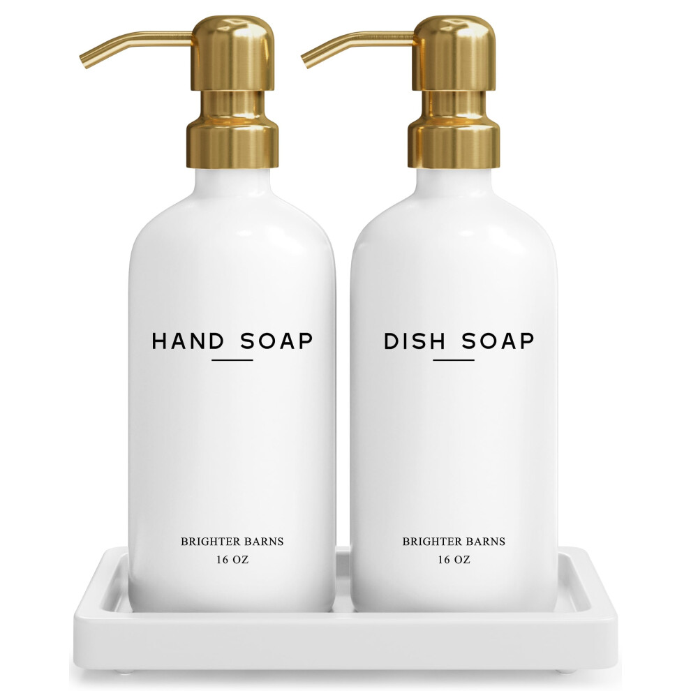 Luxury Glass Hand and Dish Soap Dispenser Set by Brighter Barns - White and Gold Kitchen Accessories & Decor (Gold) with Tray for Sink