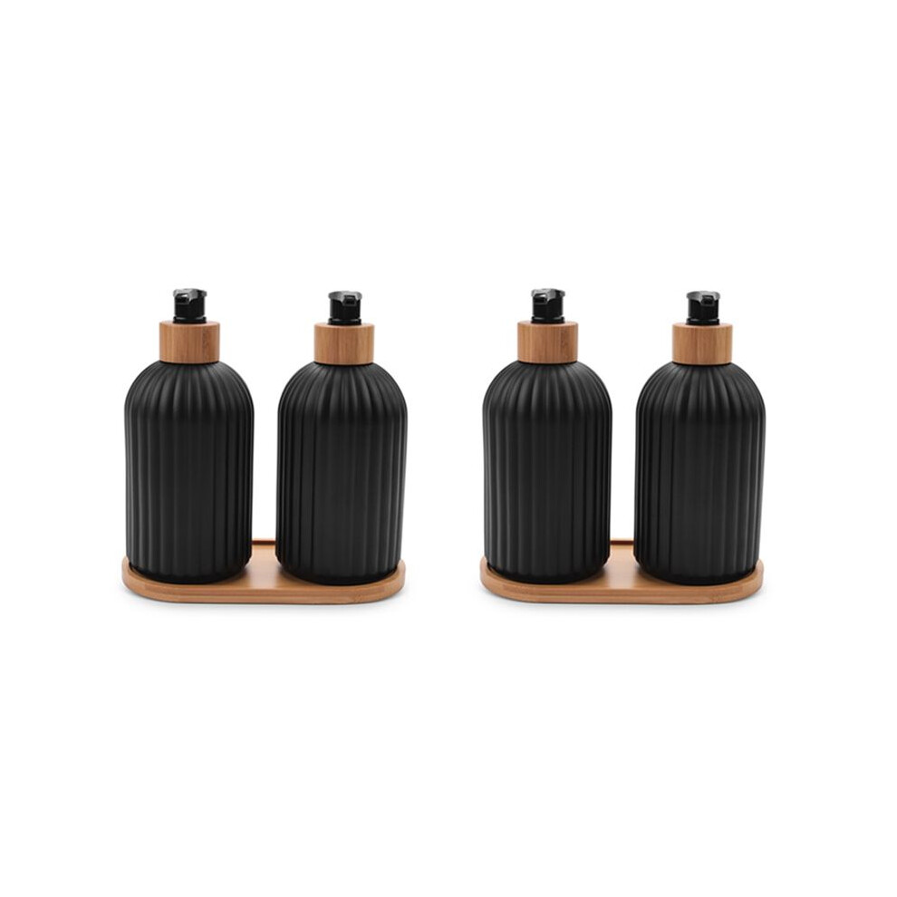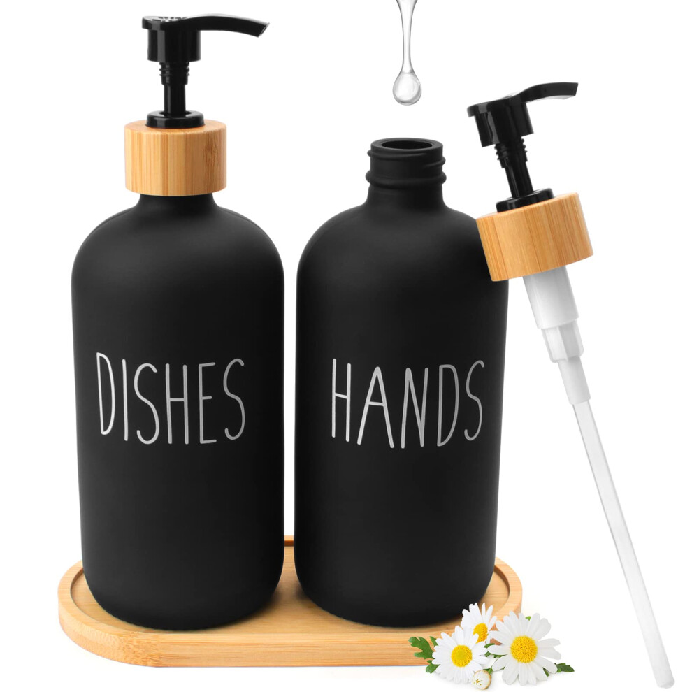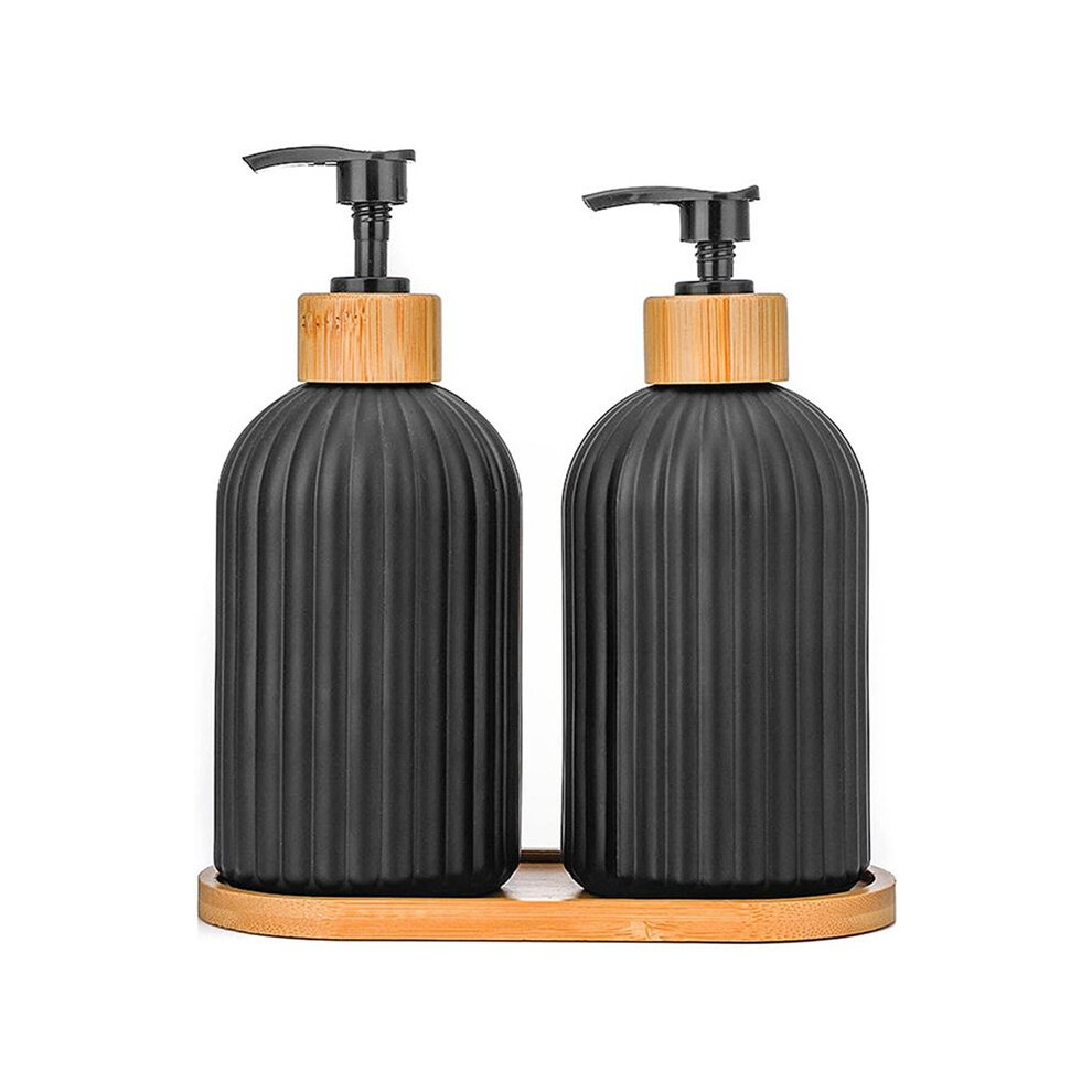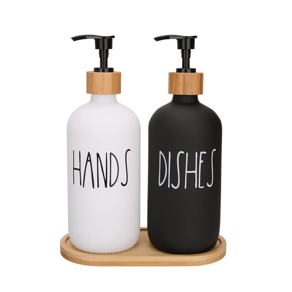 2pc 500ml Black & White Glass Hand & Dish Soap Dispenser Set with Bamboo Tray