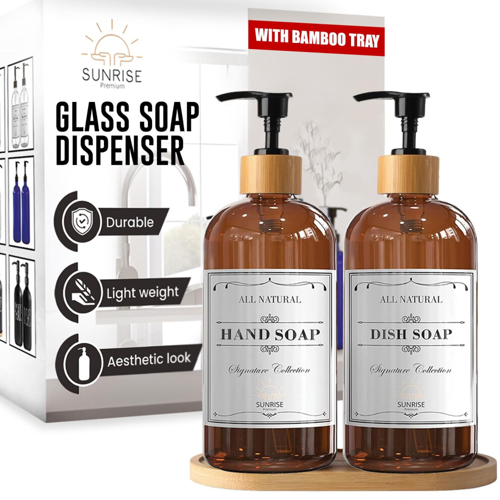 Sunrise Premium 16 OZ Thick Amber Glass Soap Dispenser Bamboo Pump with Tray 2 Pack Hand and Dish Soap Dispenser Set for Bathroom with 6 Waterproof