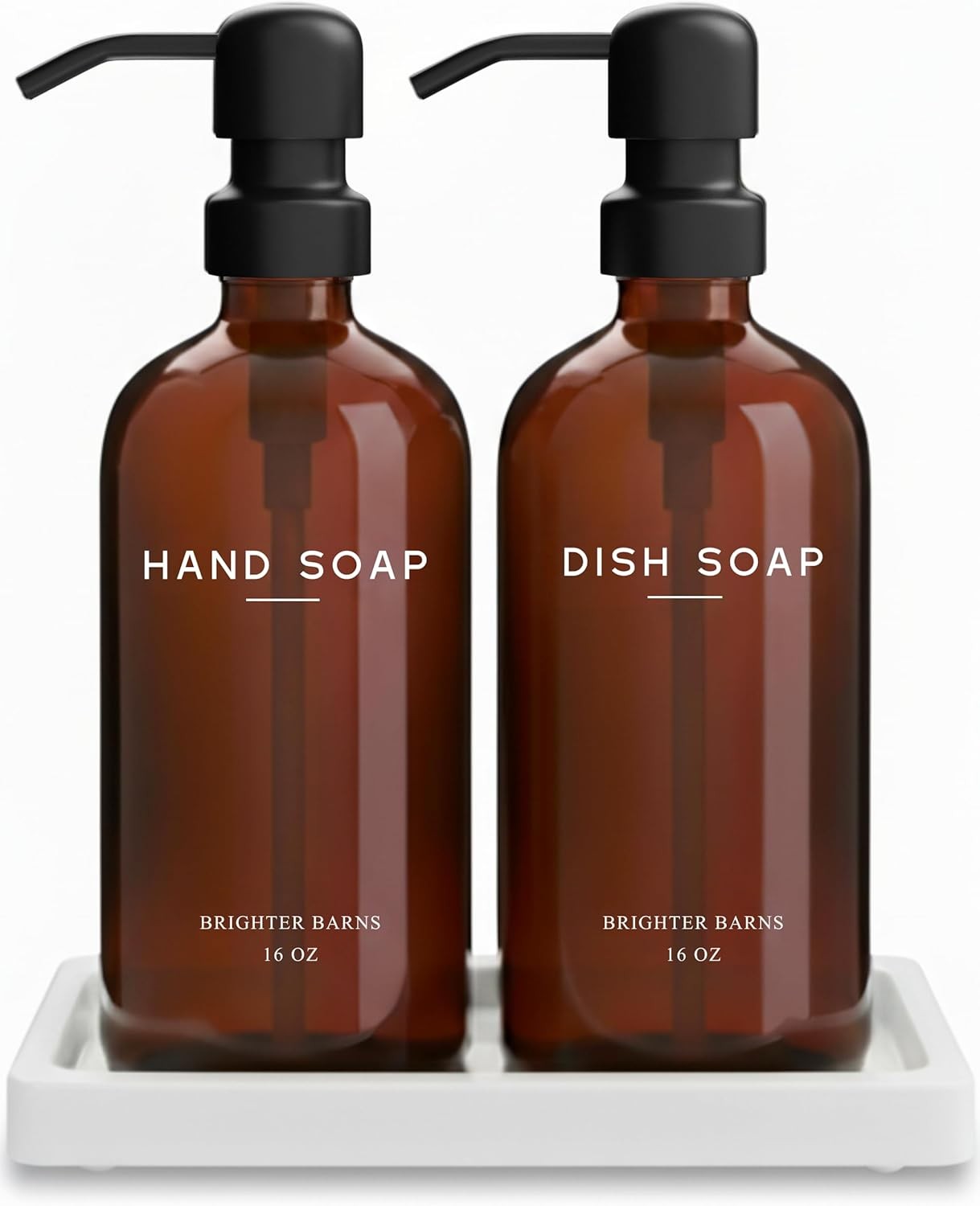 Amber Glass Hand and Dish Soap Dispenser Set by Brighter Barns - Kitchen Soap Dispenser Set with Tray - Farmhouse Soap Dispenser for Kitchen Sink -