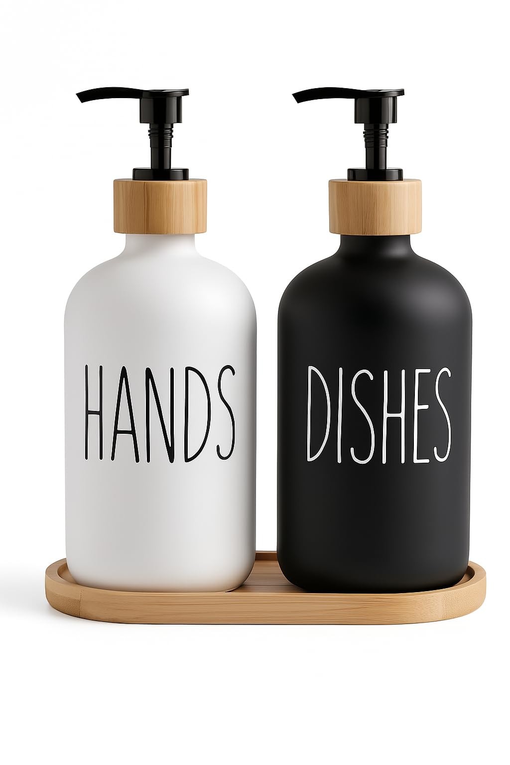 Beautiful Kitchen Hand and Dish Soap Dispenser Set with Wooden Base | Dispenses
