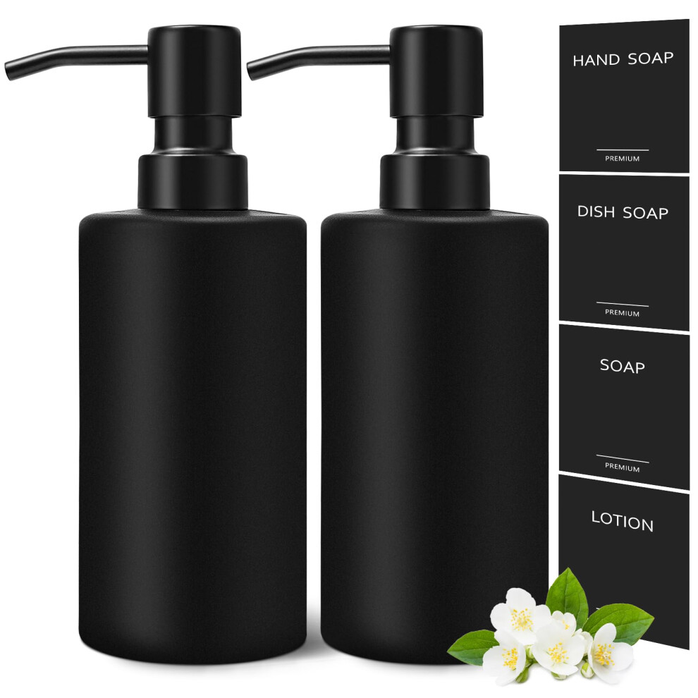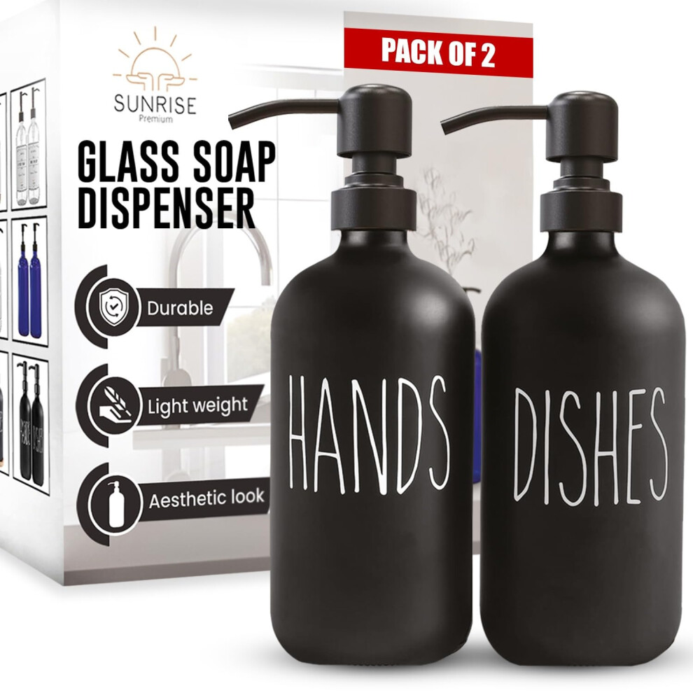 Sunrise Premium 16 OZ Thick Black Glass Soap Dispenser Matte Black Stainless Steel Pump 2 Pack Hand and Dish Soap Dispenser Set for Bathroom with 6