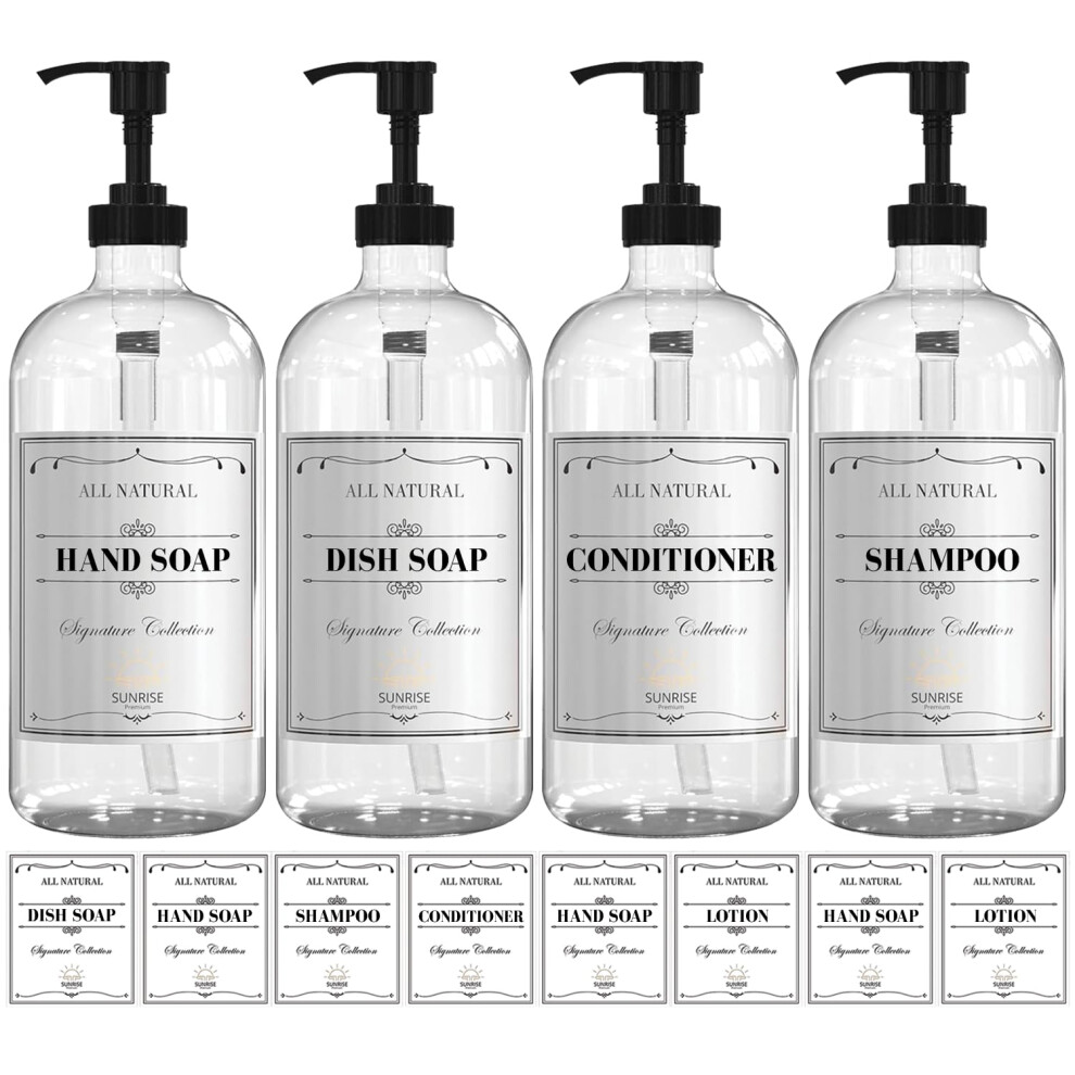 Sunrise Premium 16 OZ Clear Glass Soap Dispenser with Plastic Pump, Hand and Dish Soap Dispenser Set for Bathroom with 4 Waterproof Labels, Pack 4,