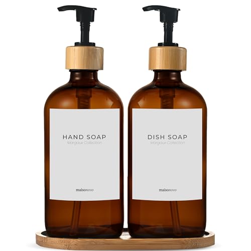 Maisonovo Kitchen Soap Dispenser Set | Hand and Dish Soap Dispenser Set with Handmade Ceramic Vanitry Tray and 16 Waterproof Labels | Amber Glass