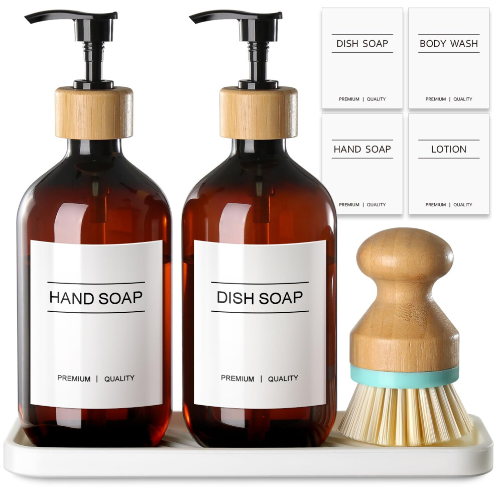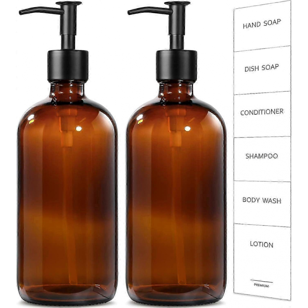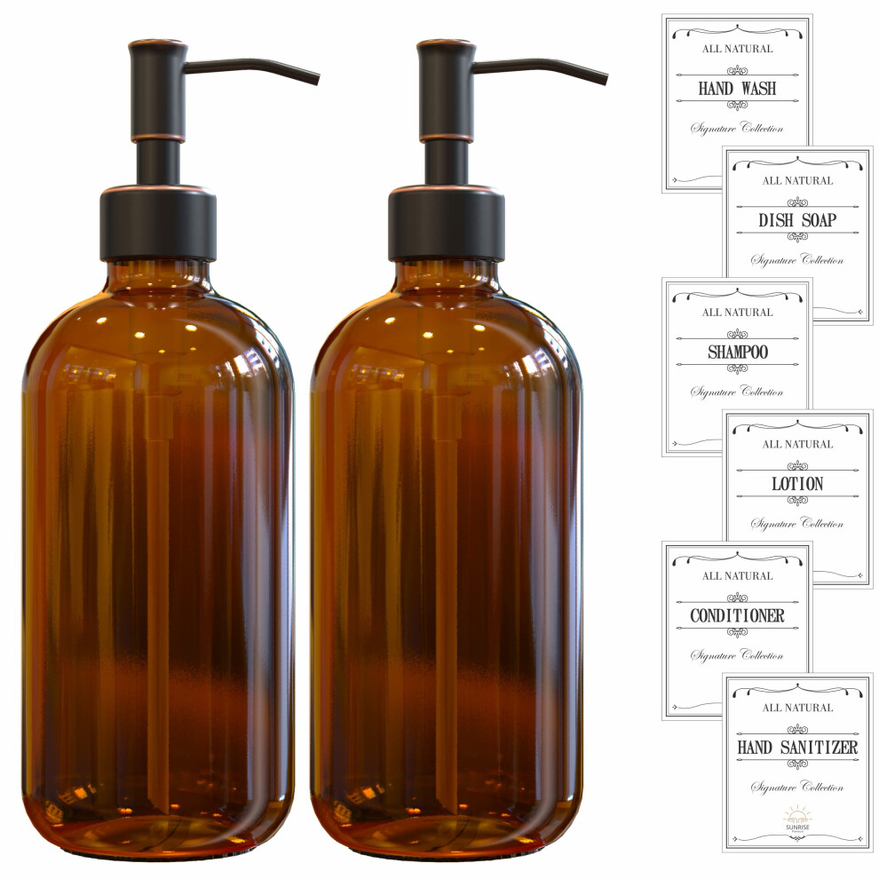 Sunrise Premium 16 OZ Thick Amber Glass Soap Dispenser with Plastic Pump 2 Pack Hand and Dish Soap Dispenser Set for Bathroom with 6 Waterproof Lab