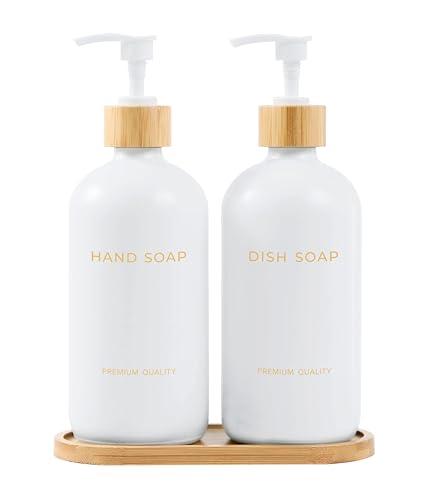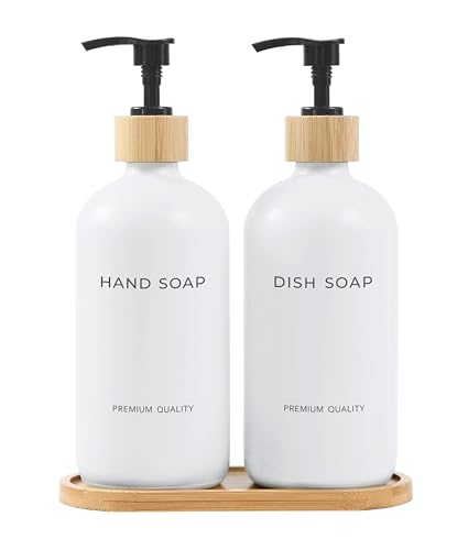 SHANNA Rustic White Glass & Bamboo Hand & Dish Soap Dispenser Set with Tray & Bamboo Dish Brush (2 Pack, 16oz)
