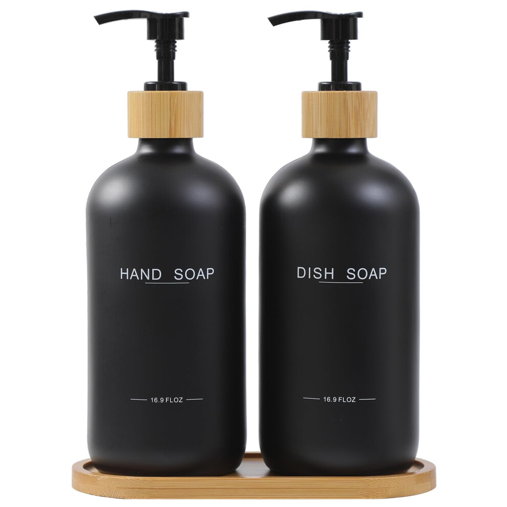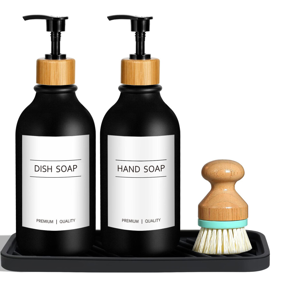 MaisoNovo Hand and Dish Soap Dispenser Kitchen Set of 2-500 ml Amber Glass Soap Dispenser Bottle with Pump Black Bamboo x 2, Bamboo Tray and Waterproof Labels