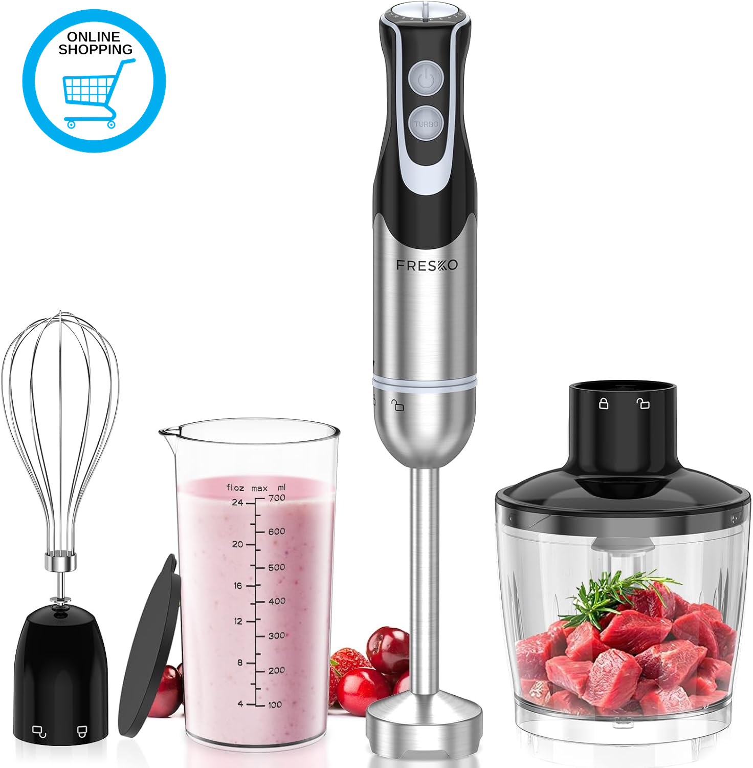 FRESKO Hand Blender 4-in-1, 1000W Electric Stick Blender Stainless Steel with 12-Speeds & Turbo Mode, Baby Food Immersion Blender Handheld with Whisk,700ml Measuring Cup & 500ml Chopper