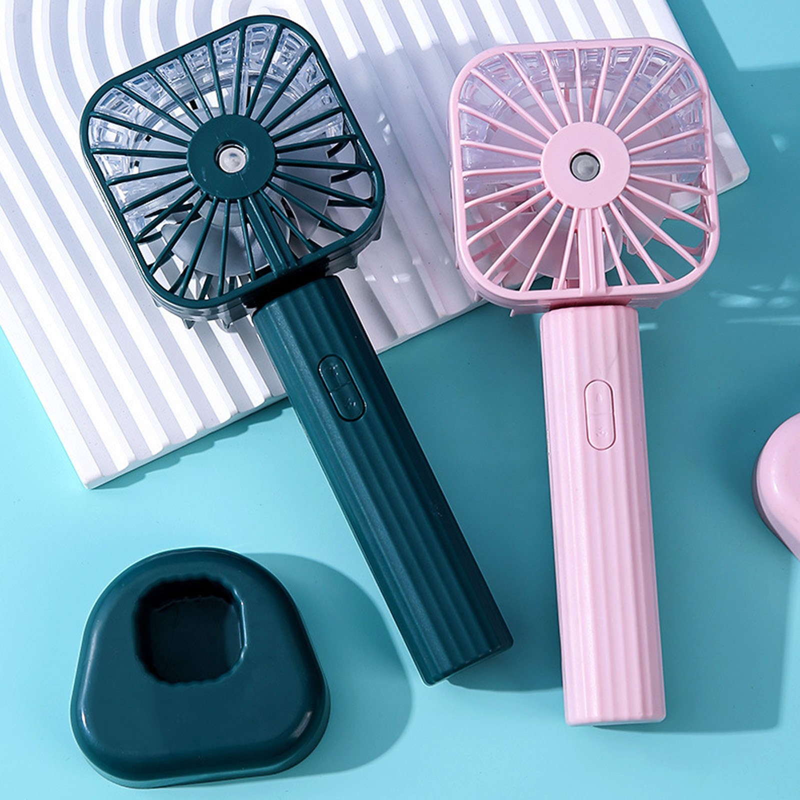 Green Hand Held Misting Fan Portable Battery Operated USB Rechargeable Quiet SET