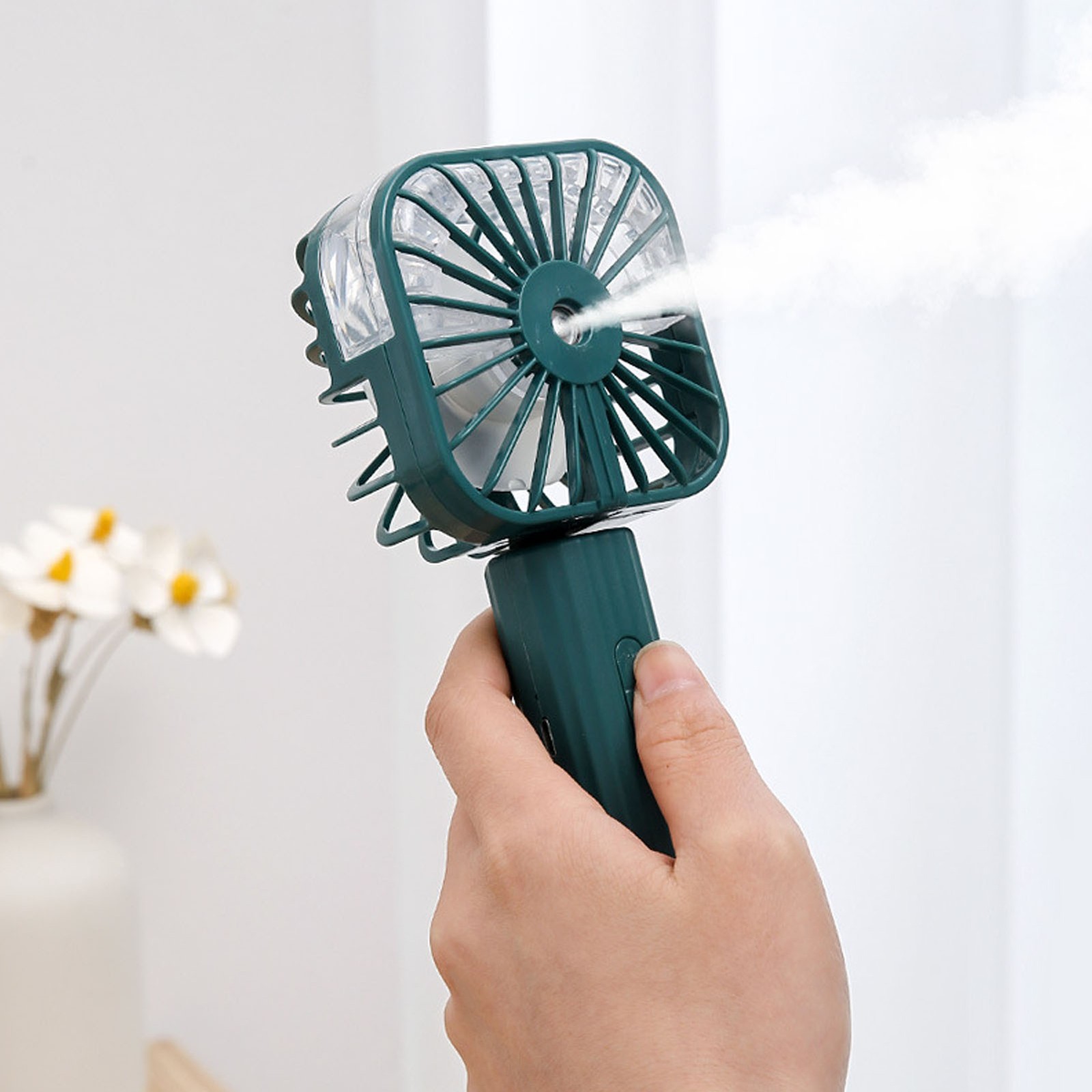 Green Hand Held Misting Fan Portable Battery Operated USB Rechargeable Quiet HOT