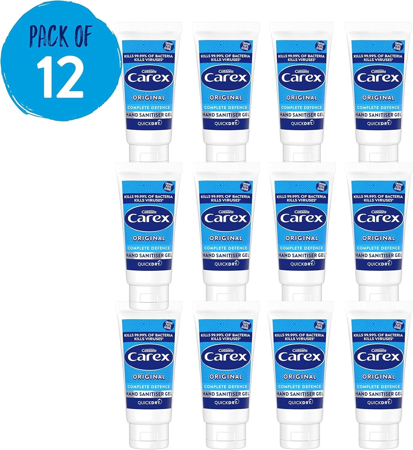12 x CAREX Hand Sanitiser Gel Quick Dry Sanitizer 70% Alcohol 50ml Travel Tubes