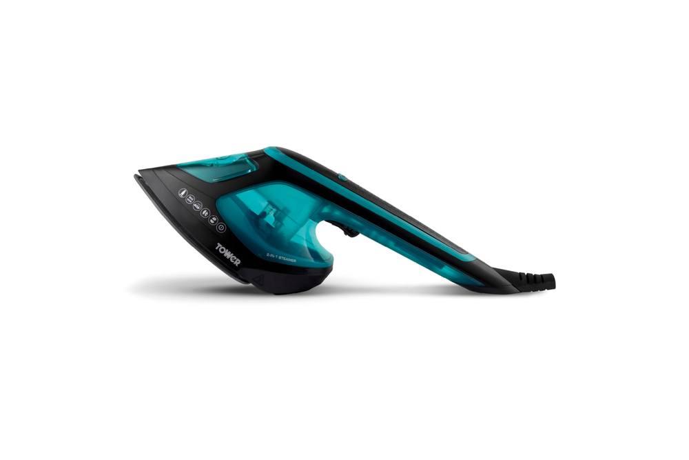 Tower T22031TL 2-in-1 Hand Garment Steamer with Iron Feature, Digital LED Display, One Temperature Technology, Double Soleplate, 25 Second Heat-up, Black and Teal