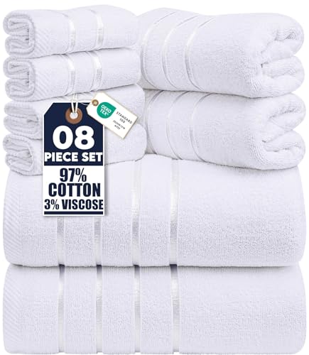 Utopia Towels 8-Piece Luxury Towel Set, 2 Bath Towels, 2 Hand Towels, and 4 Wash Cloths,97% Ring Spun Cotton Highly Absorbent Viscose Stripe Towels Ideal for Everyday use (White)