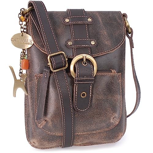 Catwalk Collection Handbags - Ladies Small Distressed Leather Cross Body Bag - Women's Messenger Bag - Adjustable Crossbody Strap - Sabine S - Brown