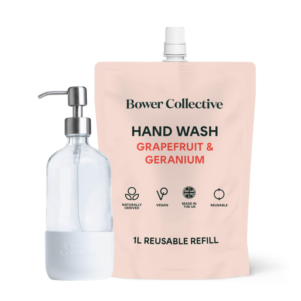 Bower Collective Natural Antibacterial Liquid Hand Soap with Glass Dispenser, Geranium & Grapefruit Handwash Refill, Eco-Friendly Soap, 1 Litre, 300+