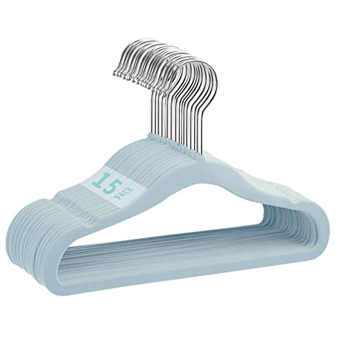 MangoKit 15 Pack Baby Hangers Velvet, Non-slip Infant and Toddler Coat Hanger, Ultra-Slim Space Saving Kids Hanger, 360 Degree Rotatory Hook Sturdy Baby Hangers for Clothes (28cm, Blue)