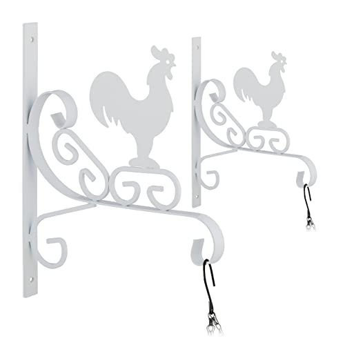 Relaxdays Hanging Basket Brackets, Set of 2, Rooster Design, Wall-Mounted, 30 x 25.5 x 2 cm, Plant Hanger, Iron, White
