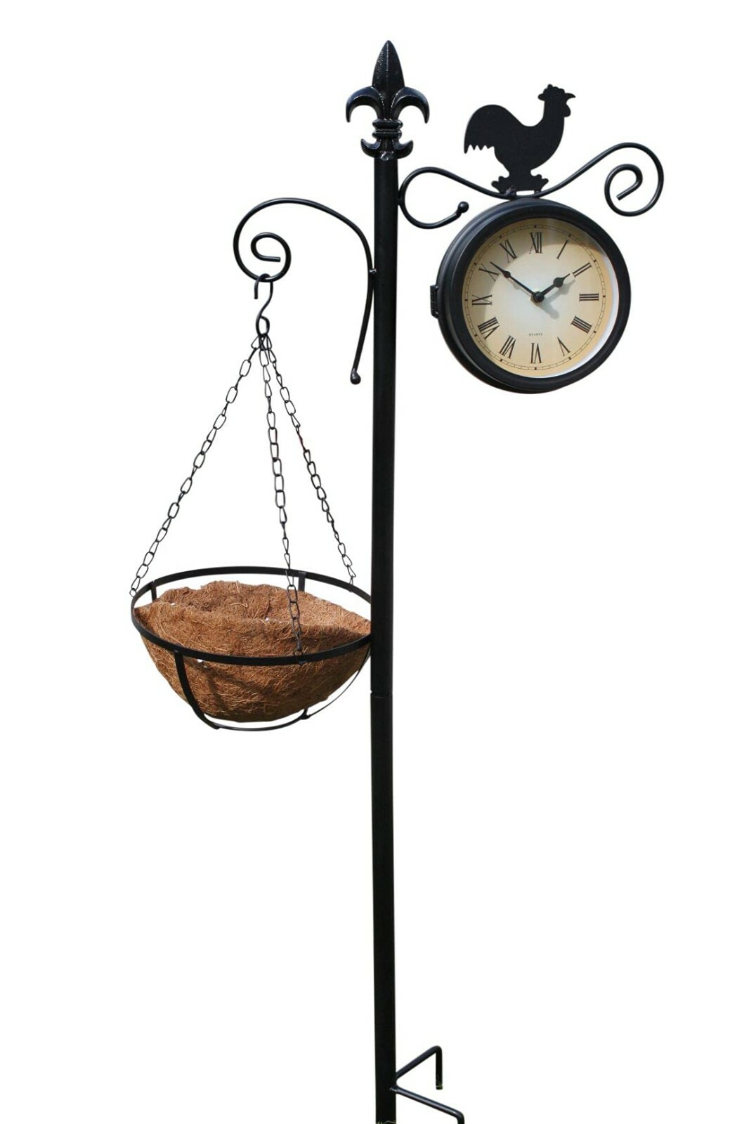 Cockerel Design Garden Clock and Thermometer with Hanging Basket & Stand