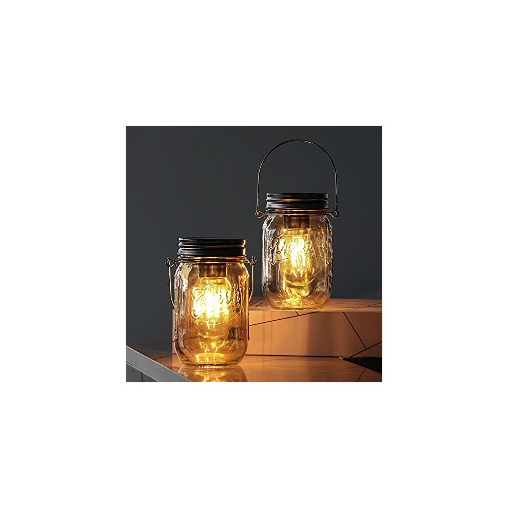 MJ PREMIER Mason Jar Lights Hanging,2-Pack Outdoor Garden Lanterns,Battery Operated Cordless Lamps,LED Bulb and Auto Timer,Patio,Indoor Lights for Camping Picnic Party Fireplace Hallway (Amber)