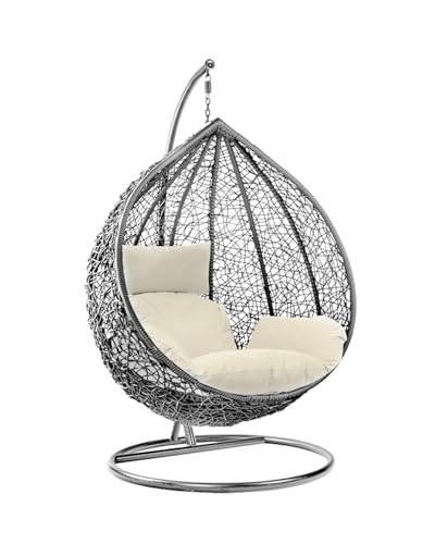 Rattan Swing Egg Chair | Holywarm Garden Swing Chair with Cushion | Indoor Outdoor Hanging Chair with Stand | Hammock Egg Chairs for Garden Bedroom Balcony (Grey Egg Chair + White Cushion)