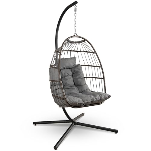 Lishetimig Hanging Egg Chair with Stand, Outdoor Indoor Swing Chairs, Rattan Foldable Hammock Chair Include Comfortable Cushion Headrest, 350LBS Capacity for Patio, Garden, Bedroom, Balcony (Grey)