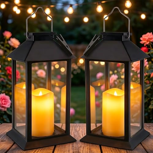 Joycome Solar Lanterns for Outside, 2 Pack Hanging Solar Lights Outdoor Garden with Flickering Candle, Waterproof Outdoor Lanterns for Garden Table Tree Patio Grave Yard Fence & Gifts - Black