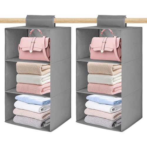 Minnhua 2Pcs Hanging Wardrobe Organiser Hanging Storage Shelves with 3 Shelves Foldable Wardrobe Clothes Organiser for Clothes Accessories for Bedroom Grey