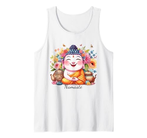 Happy Buddha Yoga Namaste with Tea and Flowers Tank Top