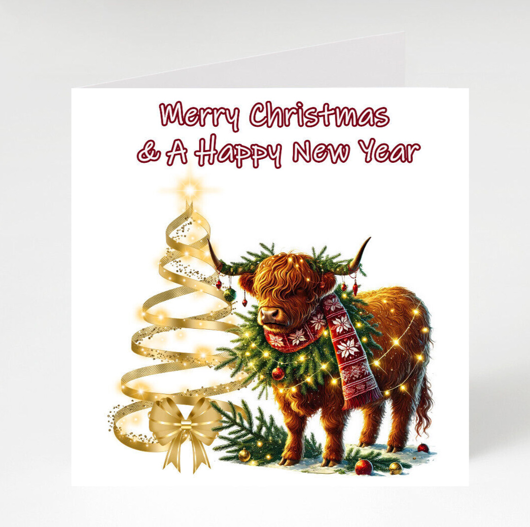 Happy NEW YEAR 2025 , Merry Christmas Highland Cow cards pack of 7